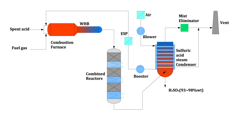 ERSATM is used to regenerate spent acid to clean and concentrated 98wt% sulfuric acid, which is of great significance to green and recycled chemical production, as it not only sloves the problem of treating spent aicd, but also provides chemical plant with clean acid for production. As of now, Keyon Porcess has finished design of multiple spent acid regeneration units.
