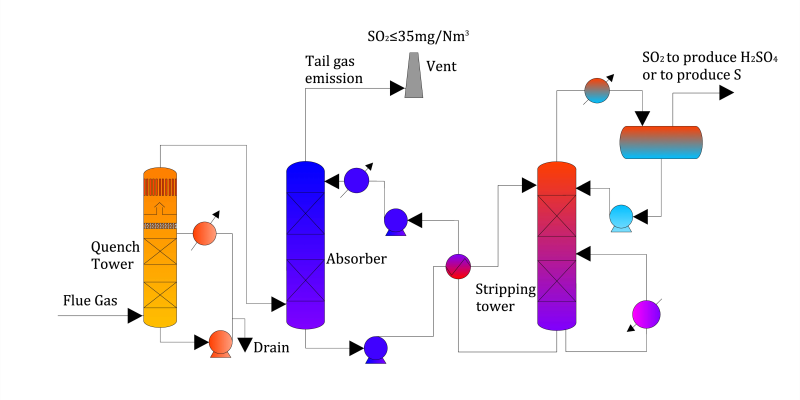 Flue gas coming from coal or oil burning combustors and heaters in petrochemical plant contains 100~3000ppm SO2 and NOx. Through cooperation with domestic universities, overseas engineering companies and catalyst producers, Keyon Process provides clients with highly efficient and reliable desulfurization and denitration solutions.We adopt a unique solvent that has highly selective and strong SO2 adsorption . The solvent can deeply remove SO2 in flue gas to make tail gas meet ultra-low SO2 emission requirement ( SO2≤35mg/Nm3). SO2 in the solvent can be desorbed for regeneration usage, in the meantime released SO2 can be used to produce sulfur or sulfuric acid.