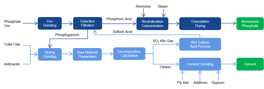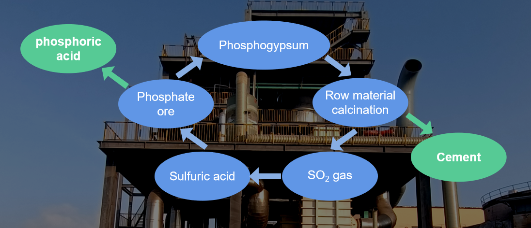 The recycling process can treat phosphogypsum and produce two products, cement and sulfuric acid, and recycle.